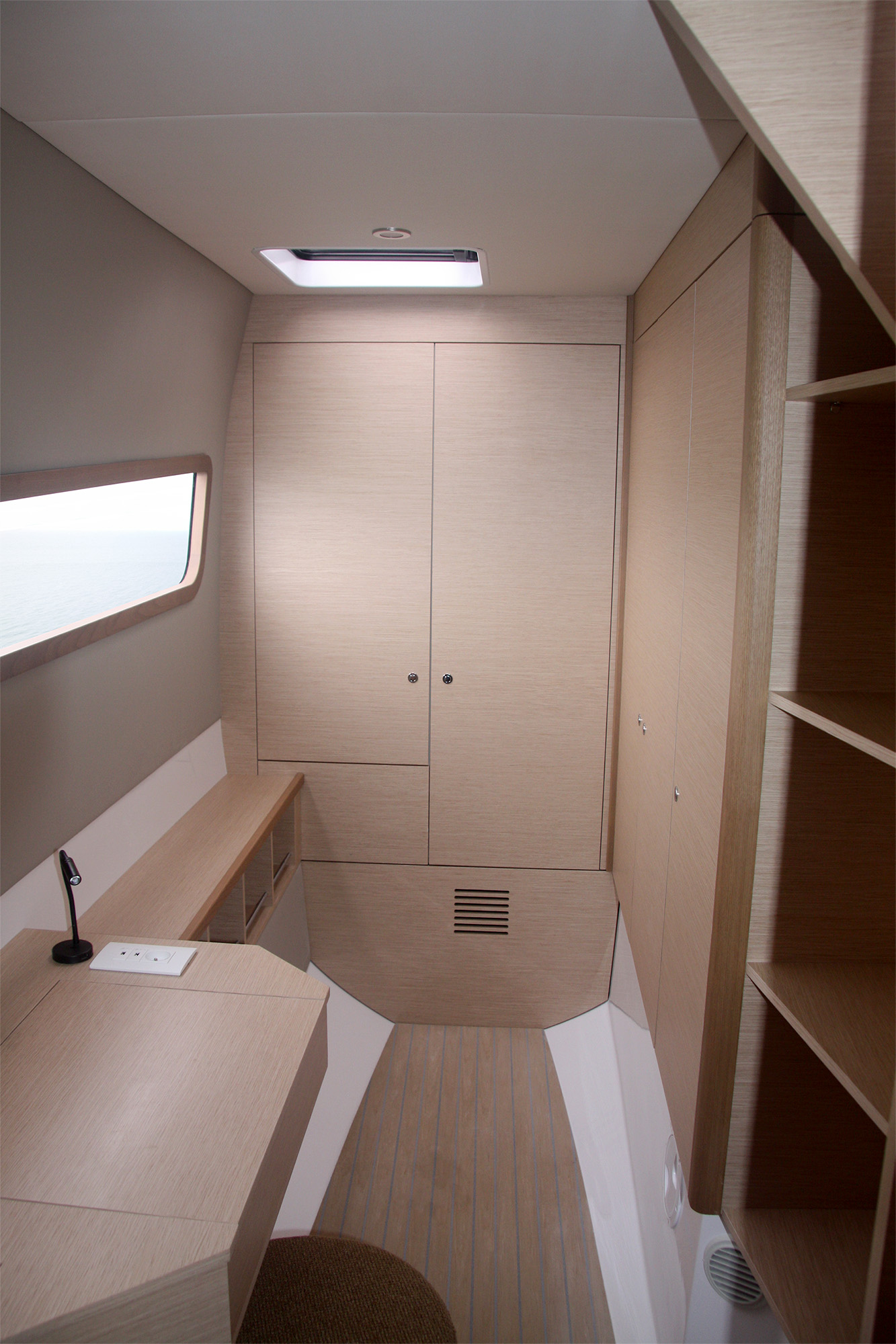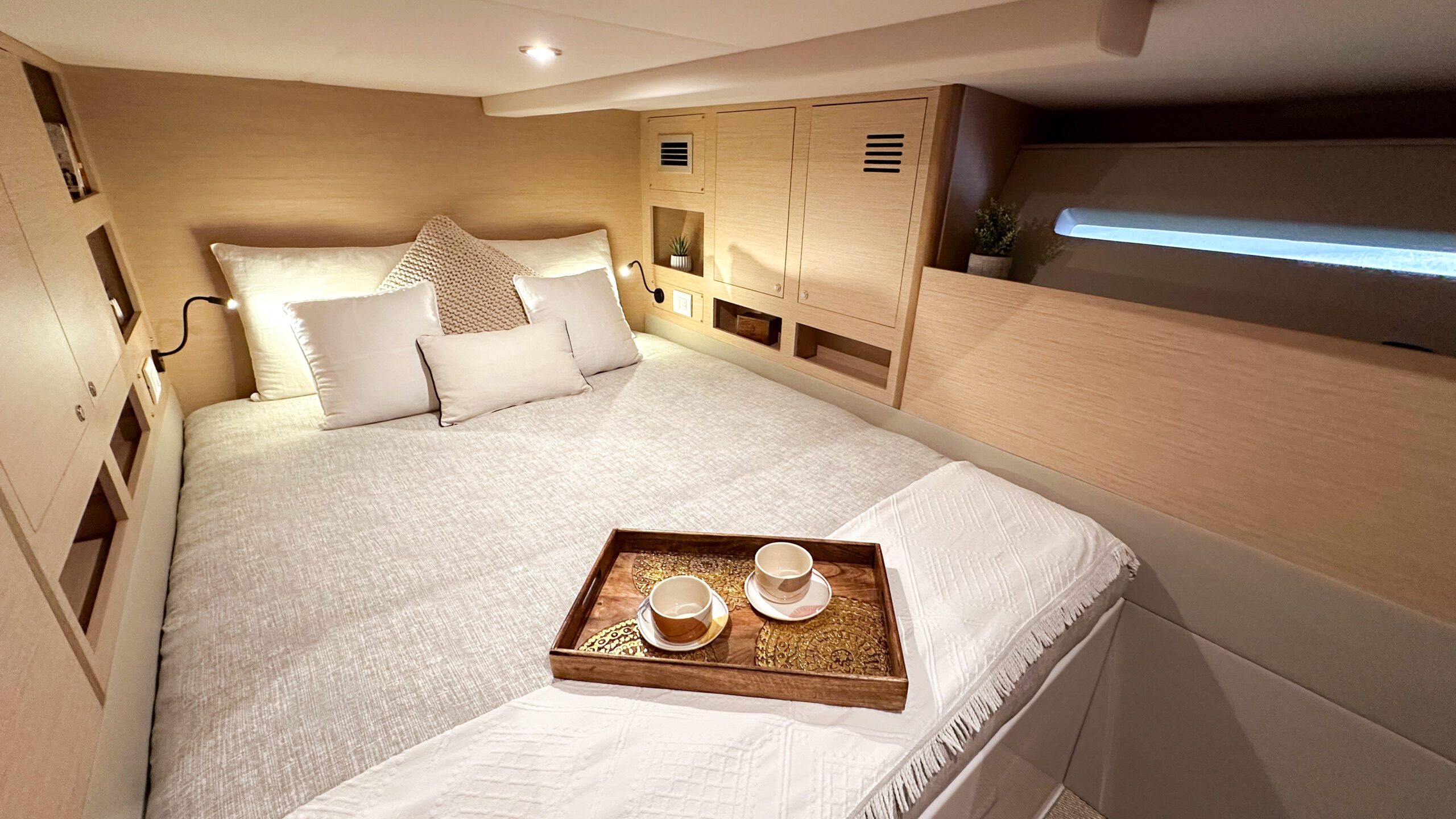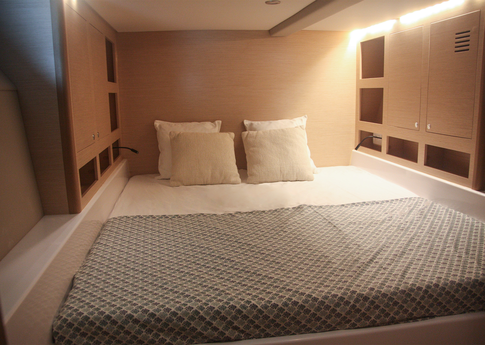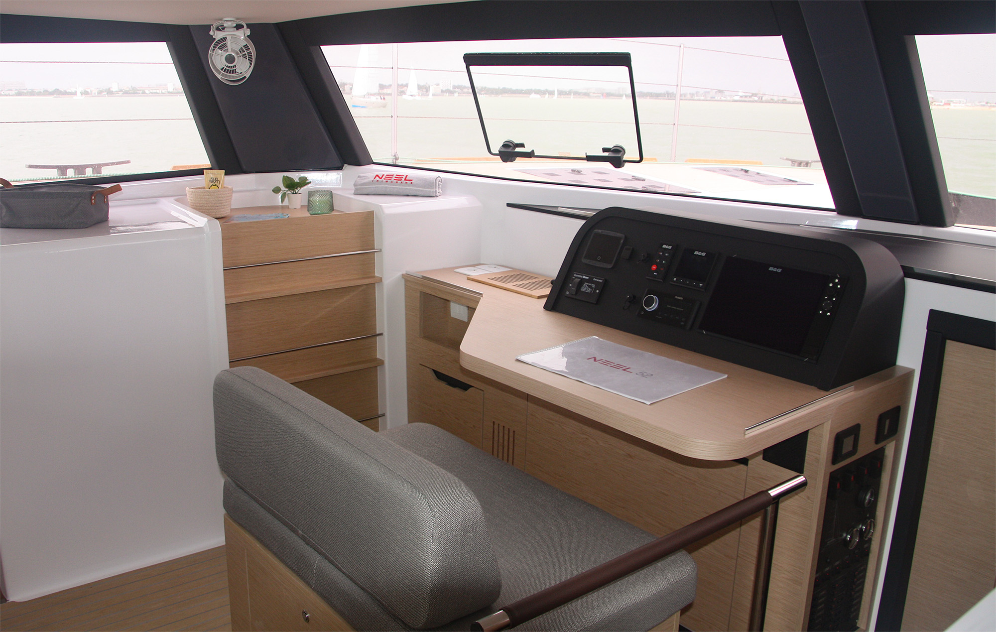 The living space on one level is highly ergonomic and entirely open plan, offering exceptional luminosity. The kitchen and the chart table face forwards. The panoramic view from this huge saloon is breathtaking. Both elegant and simple, the decoration lends the NEEL 52 a look of timeless distinction and gives the ample living space a calming atmosphere.