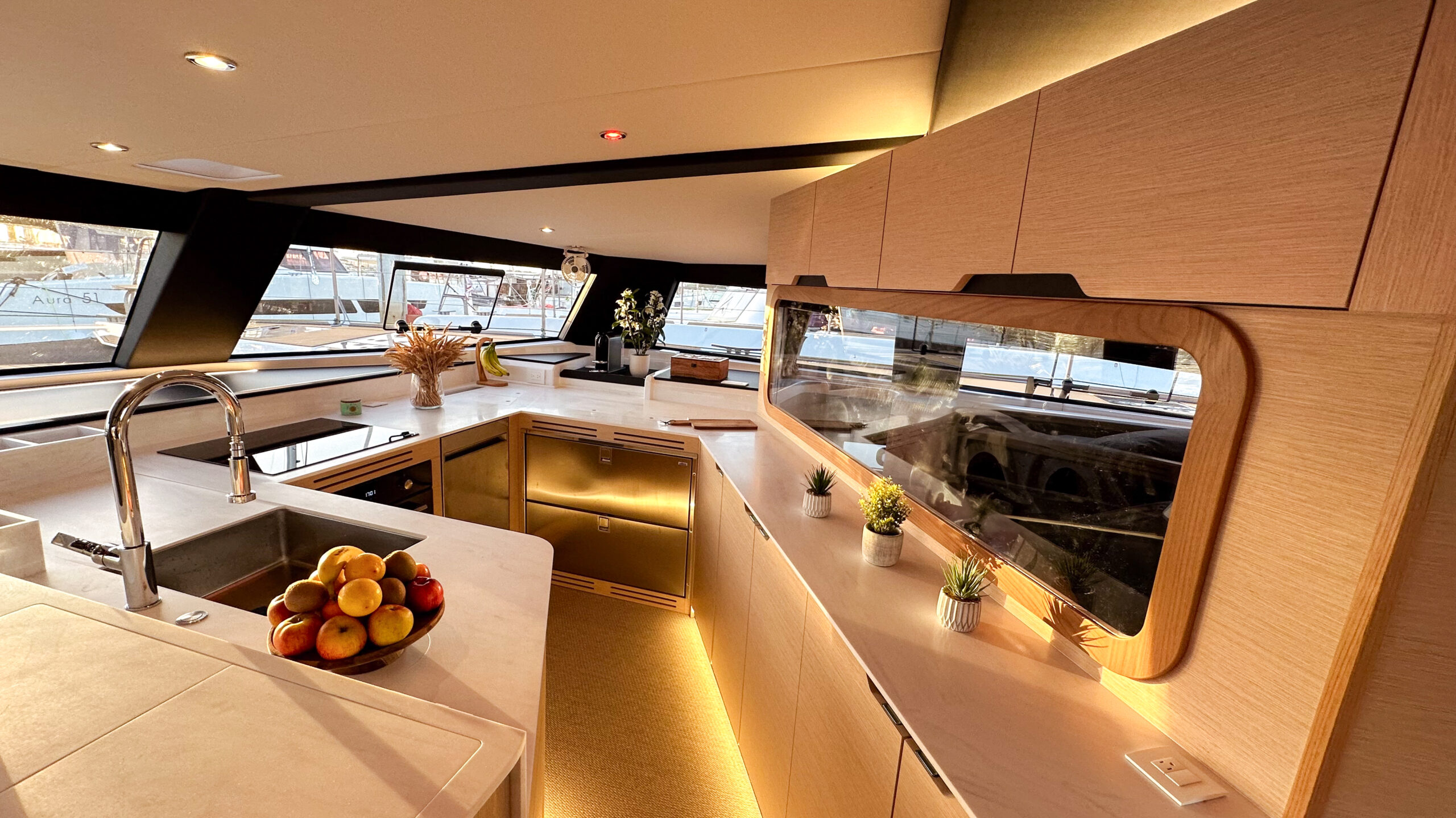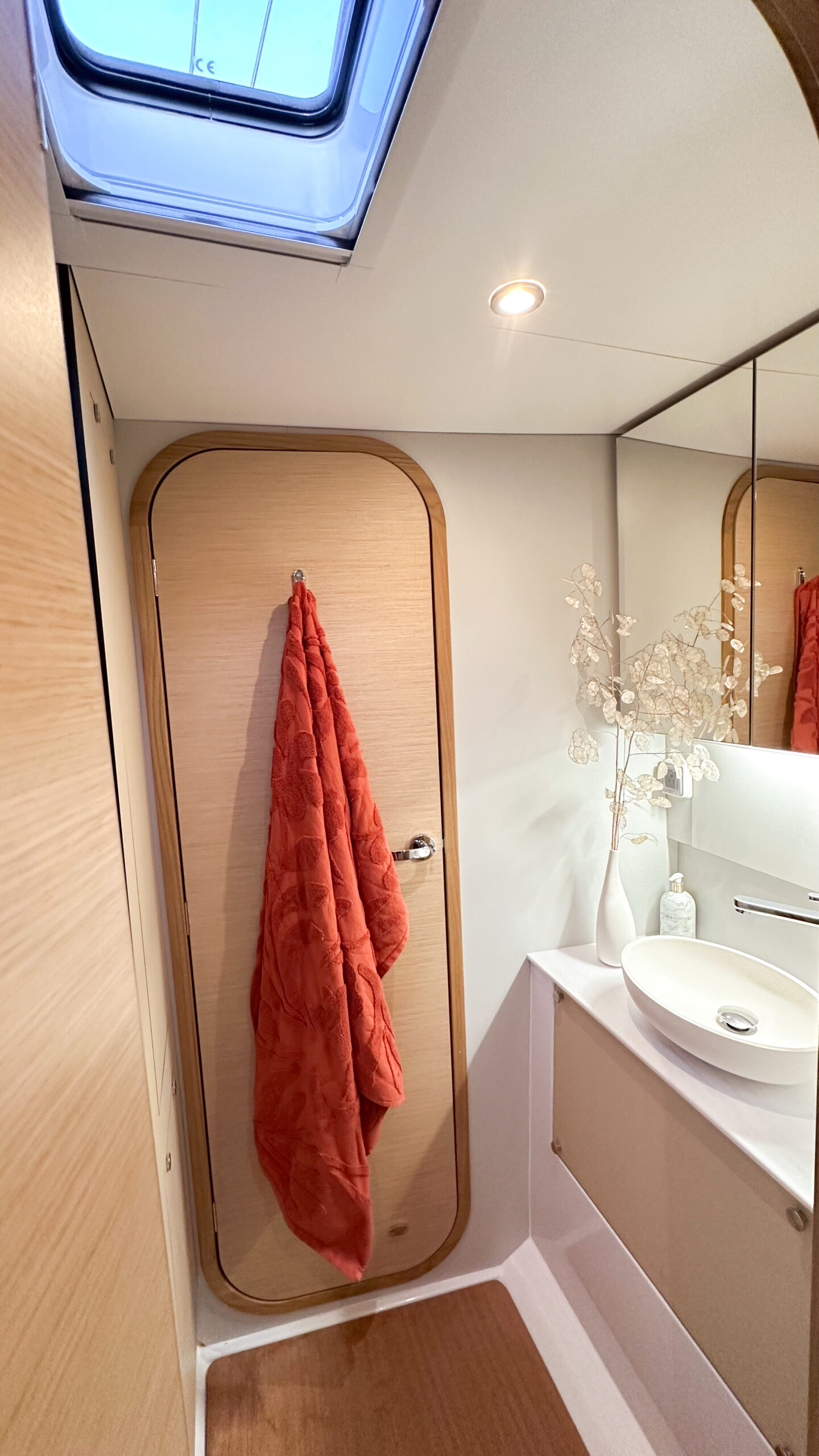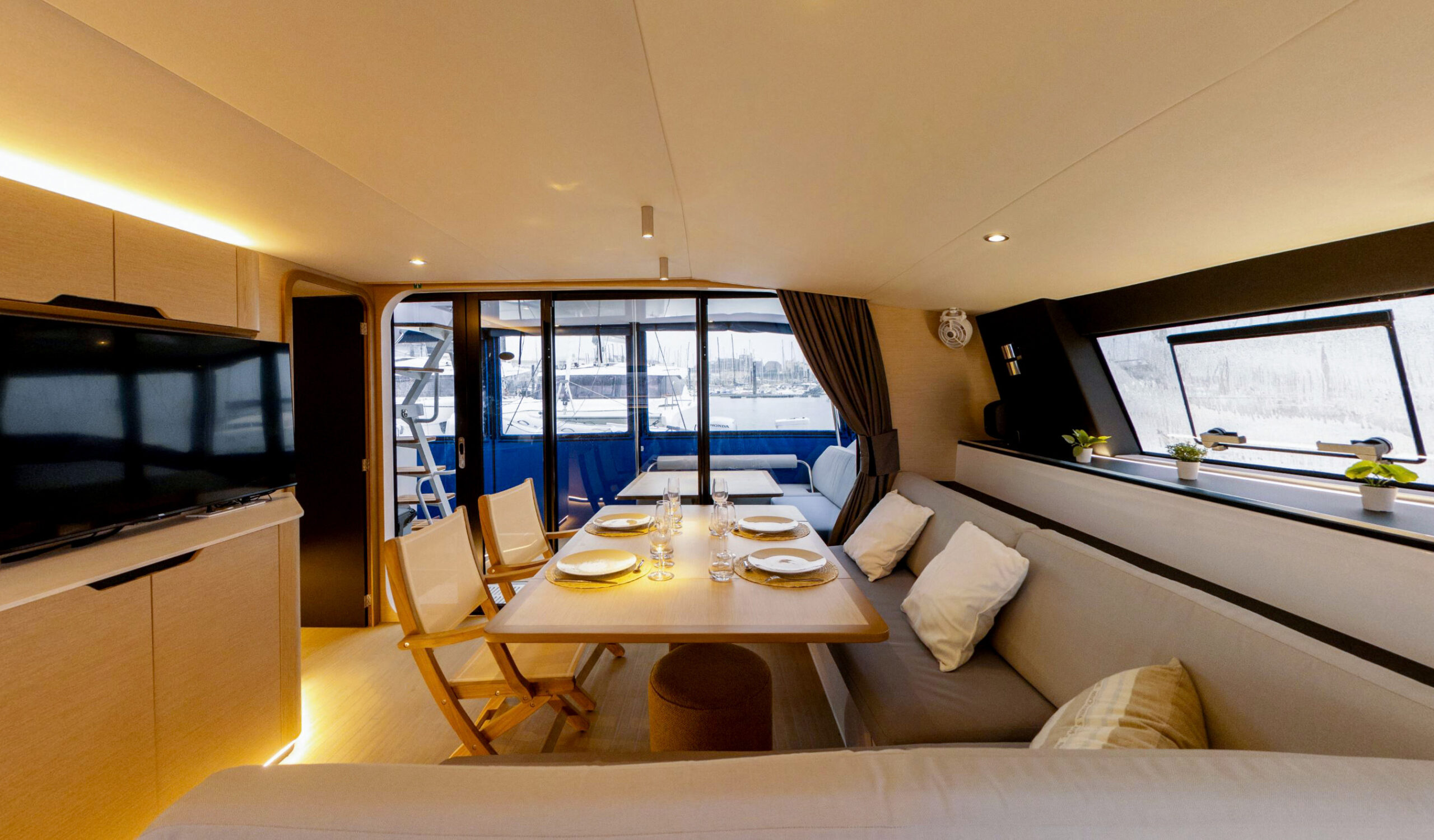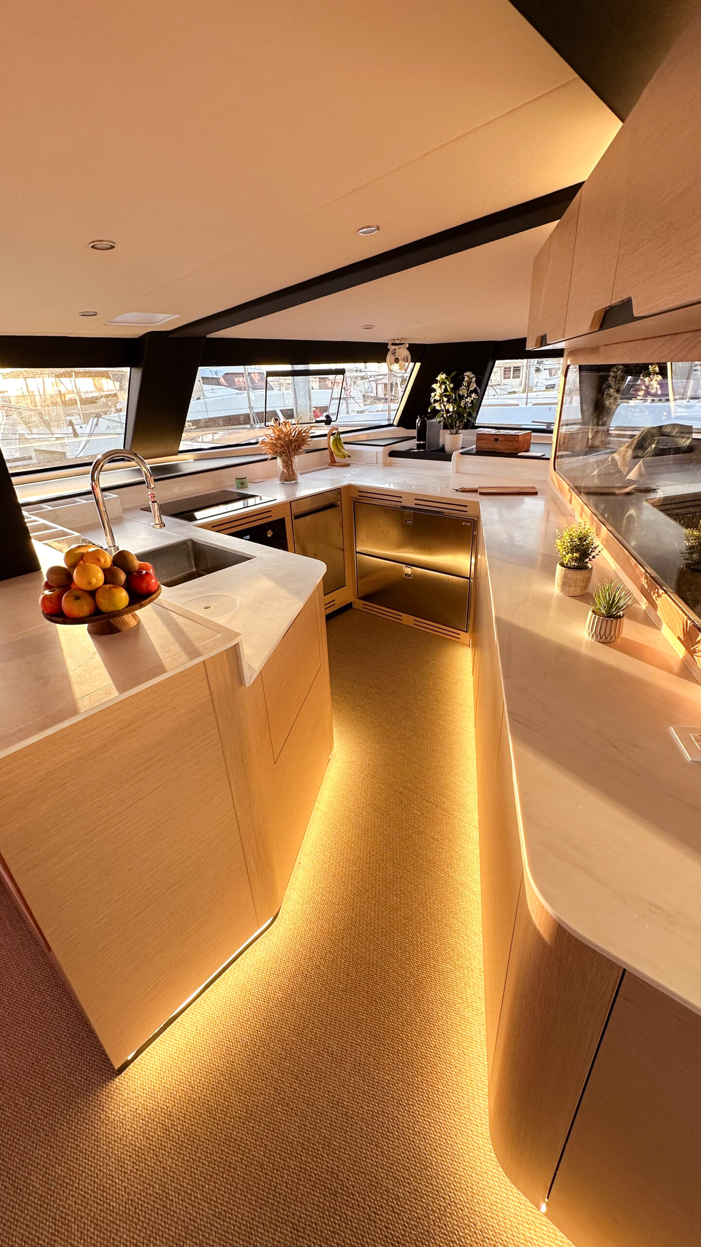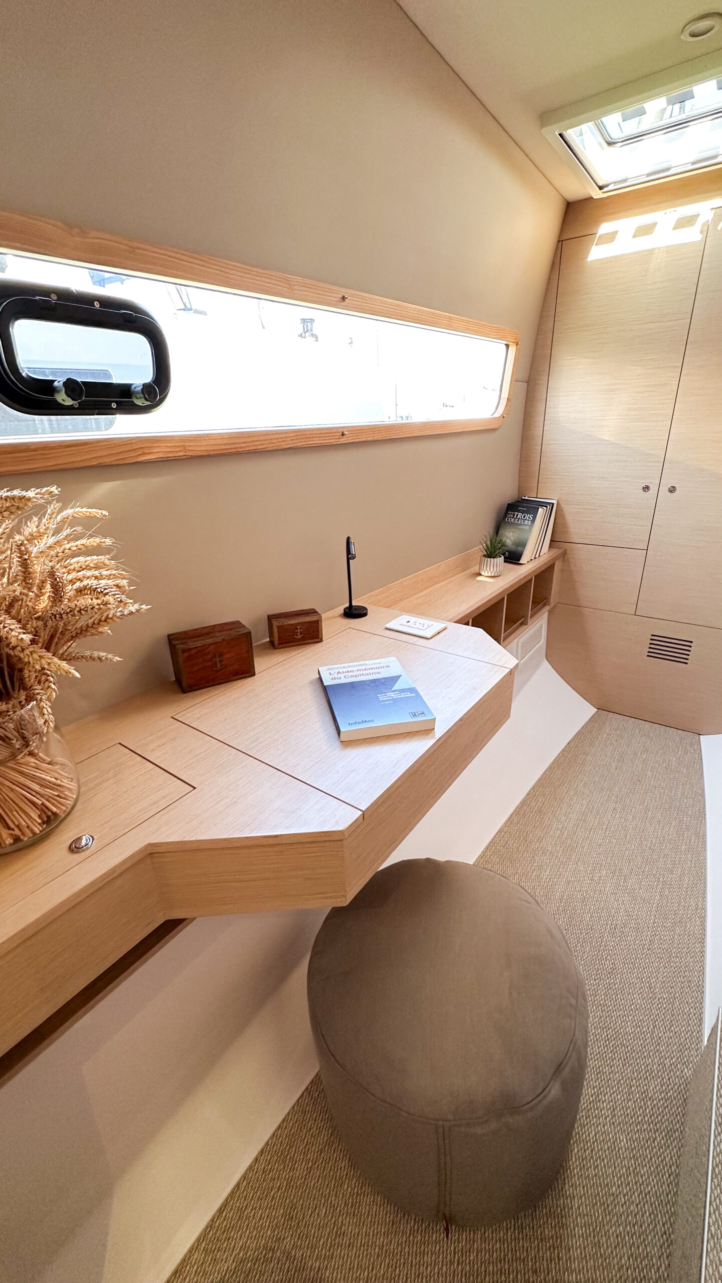 The living space on one level is highly ergonomic and entirely open plan, offering exceptional luminosity. The kitchen and the chart table face forwards. The panoramic view from this huge saloon is breathtaking. Both elegant and simple, the decoration lends the NEEL 52 a look of timeless distinction and gives the ample living space a calming atmosphere.