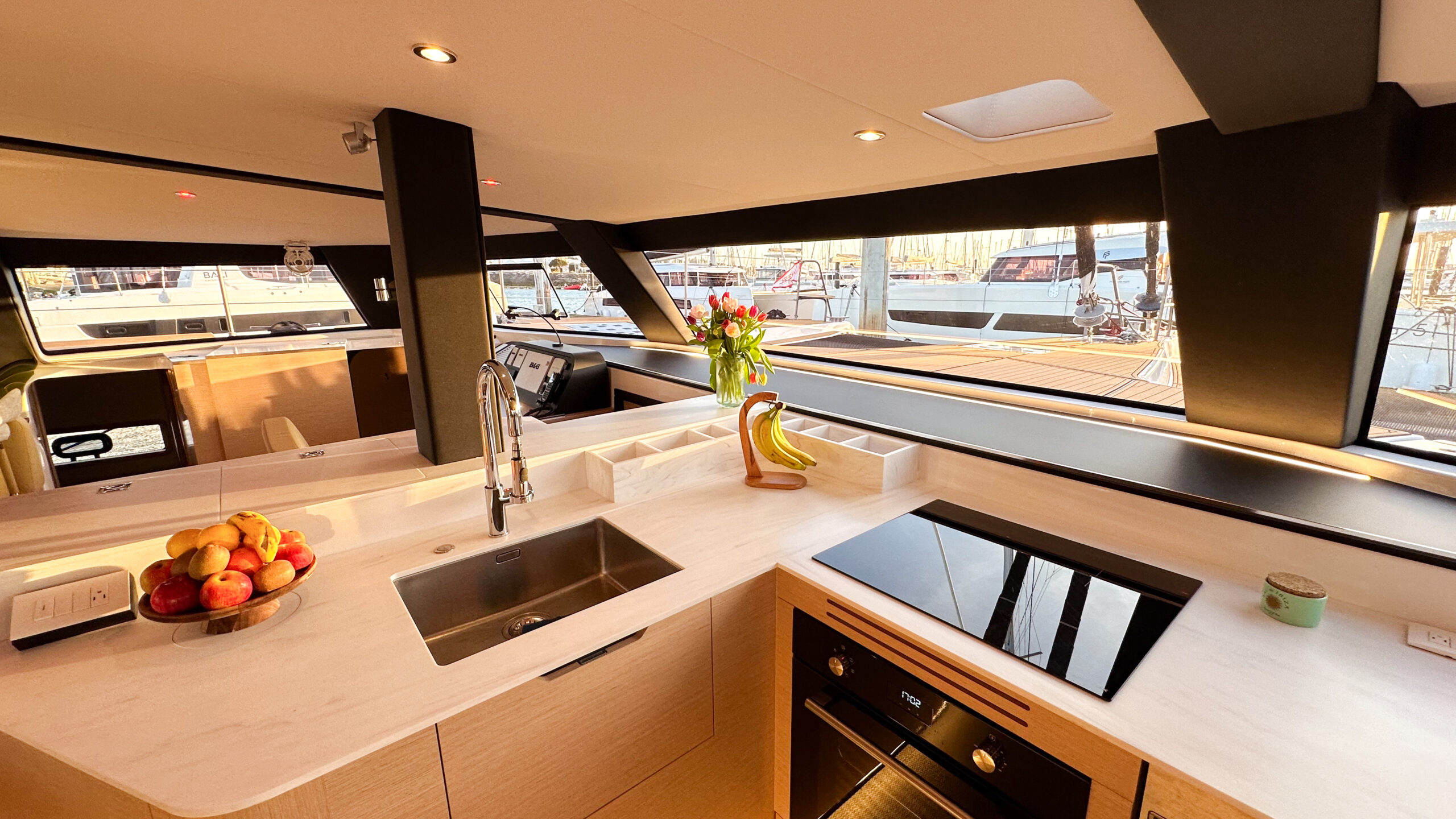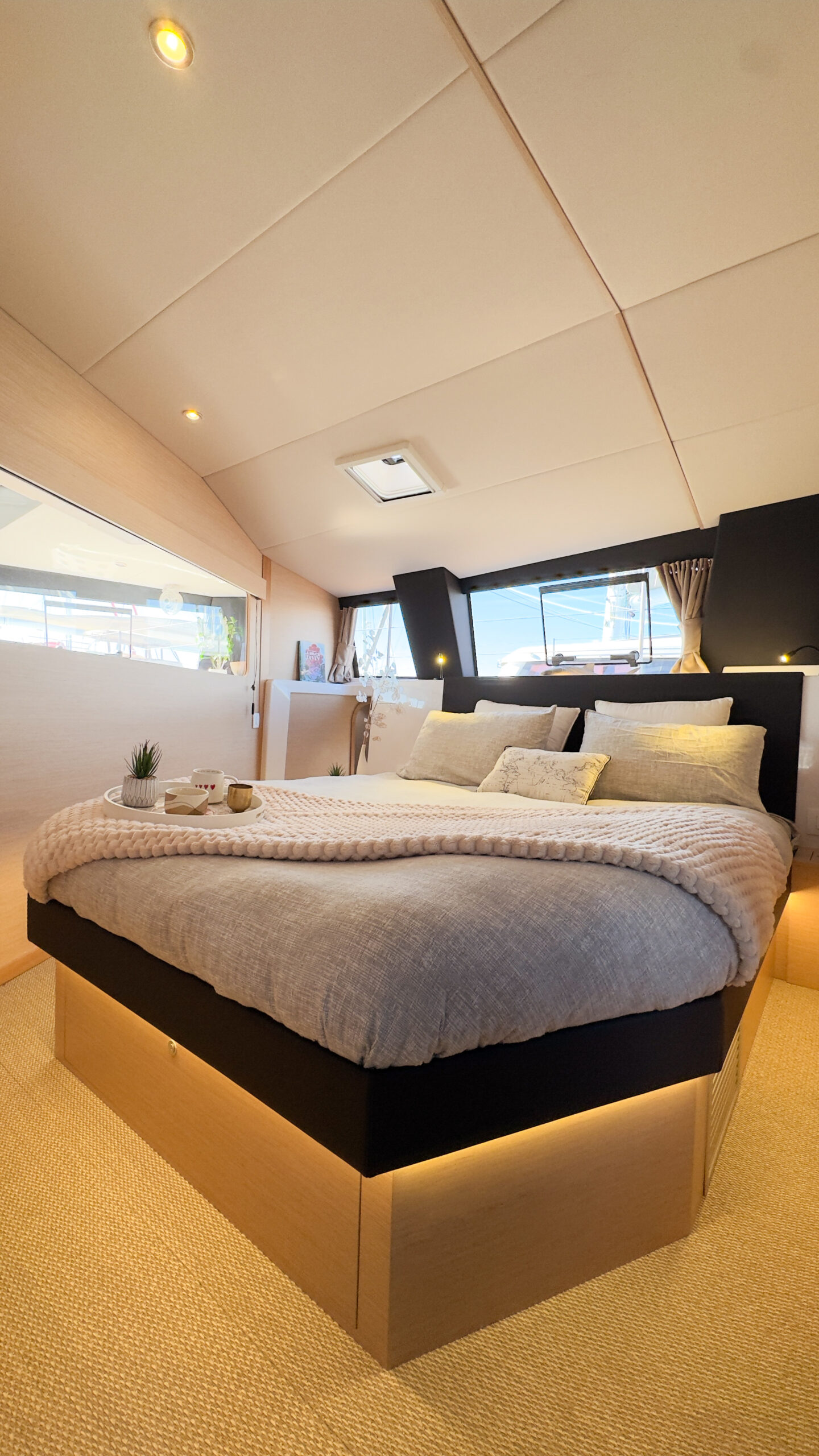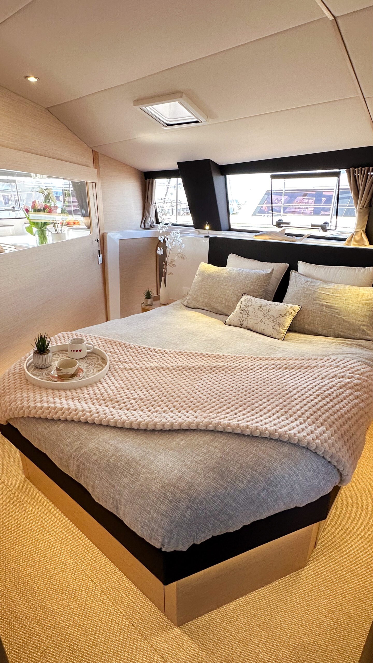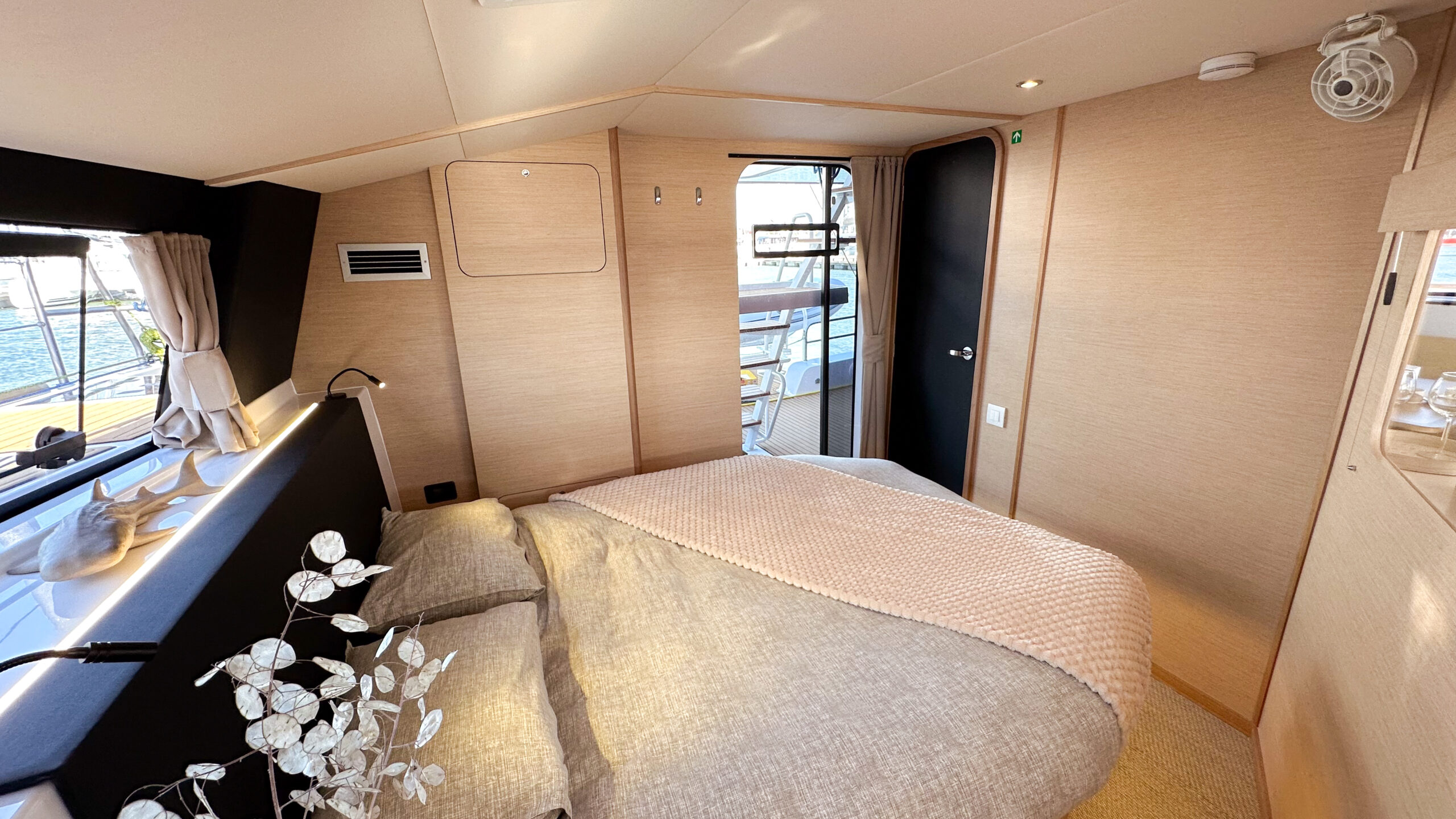 The living space on one level is highly ergonomic and entirely open plan, offering exceptional luminosity. The kitchen and the chart table face forwards. The panoramic view from this huge saloon is breathtaking. Both elegant and simple, the decoration lends the NEEL 52 a look of timeless distinction and gives the ample living space a calming atmosphere.