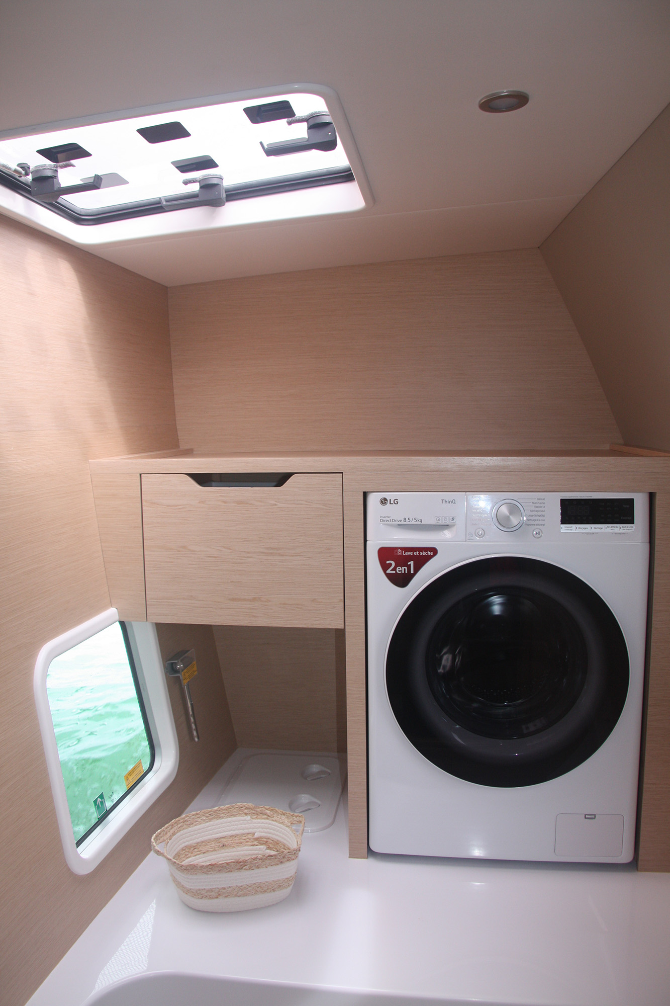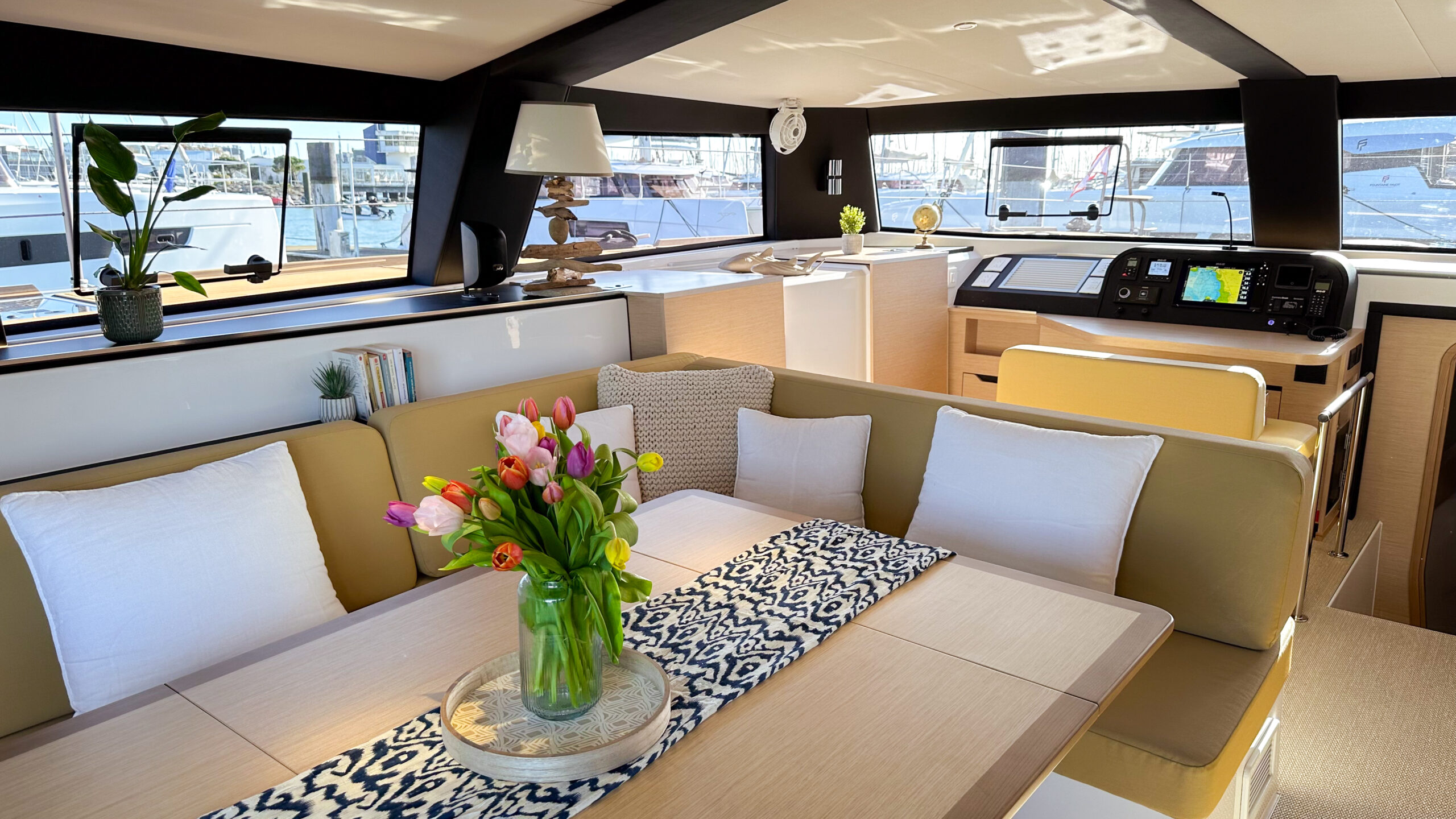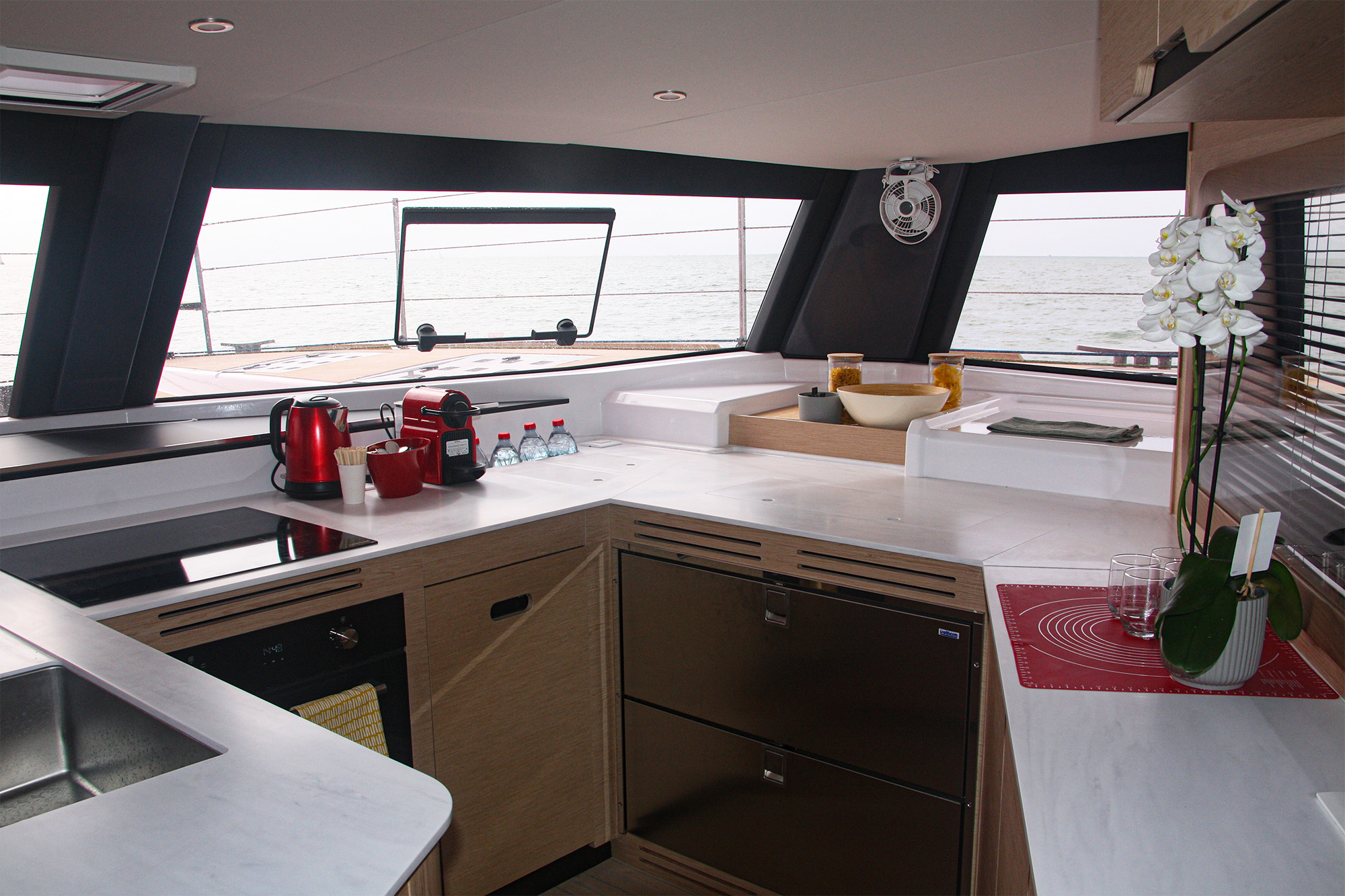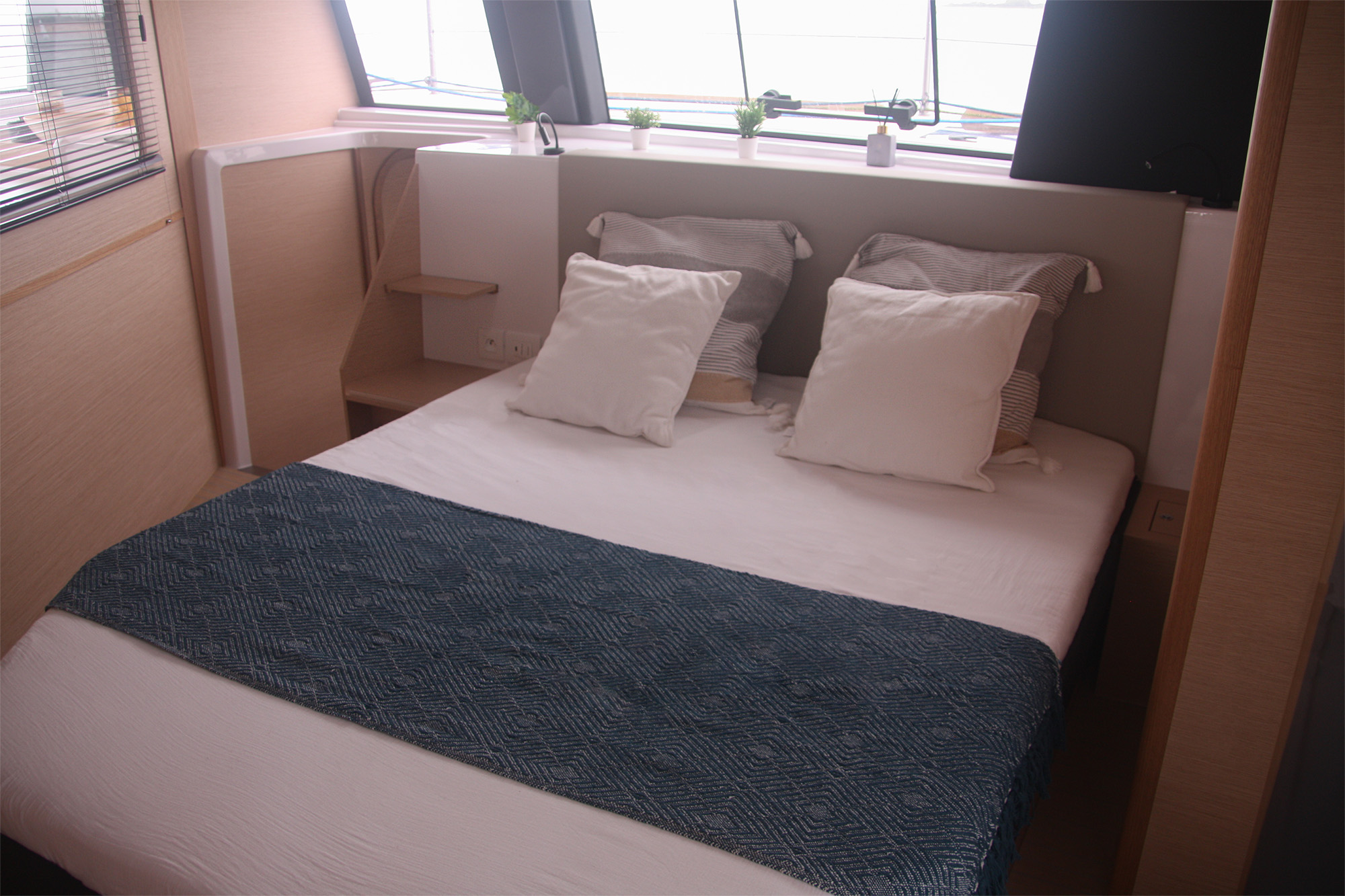 The living space on one level is highly ergonomic and entirely open plan, offering exceptional luminosity. The kitchen and the chart table face forwards. The panoramic view from this huge saloon is breathtaking. Both elegant and simple, the decoration lends the NEEL 52 a look of timeless distinction and gives the ample living space a calming atmosphere.