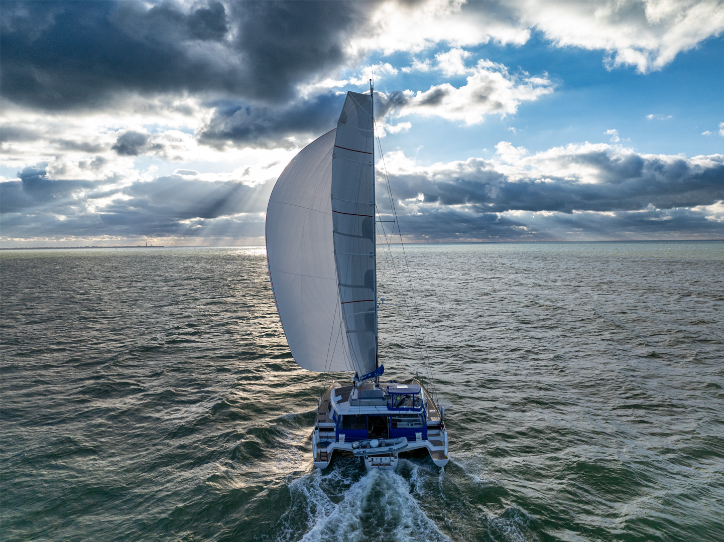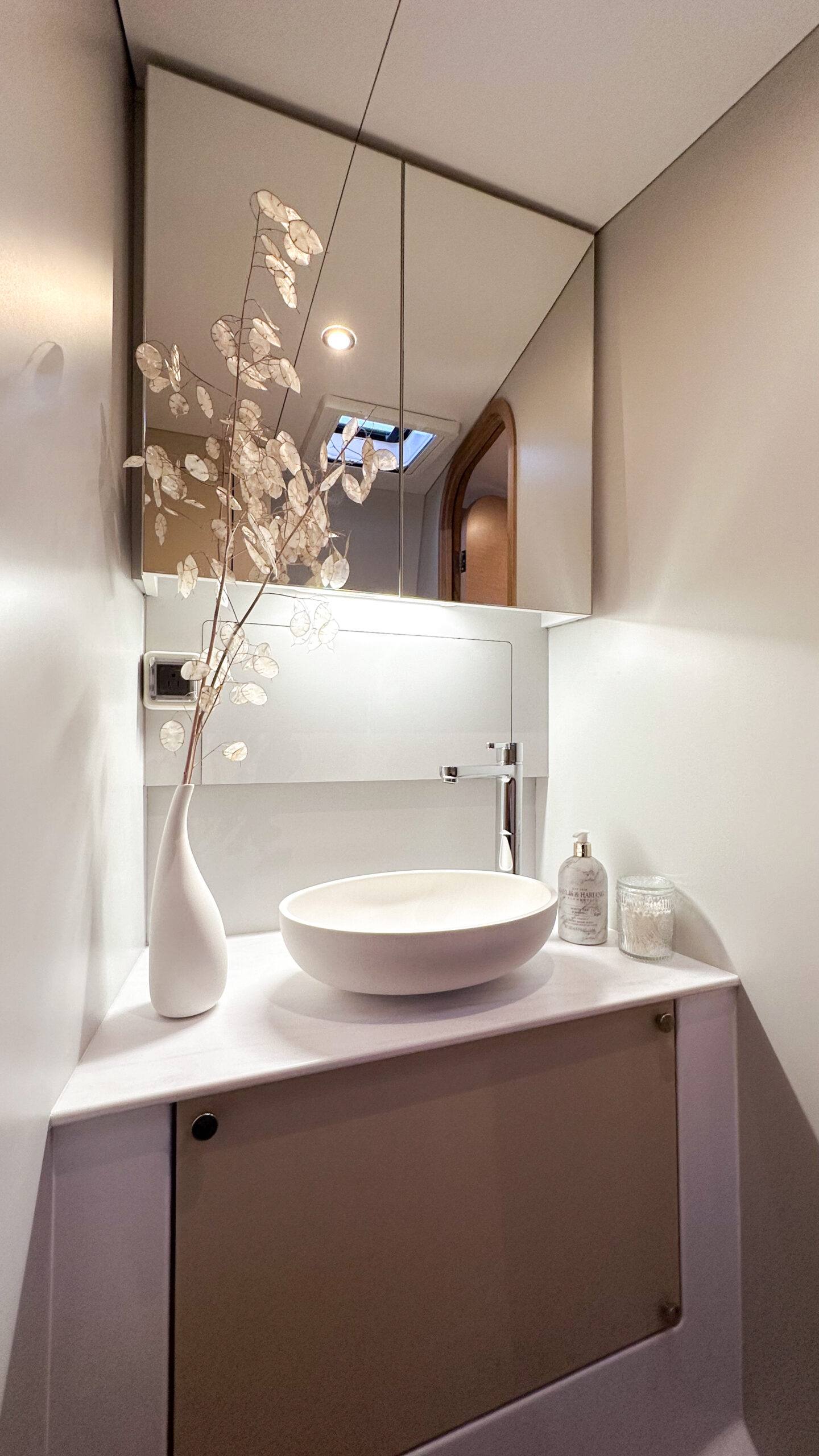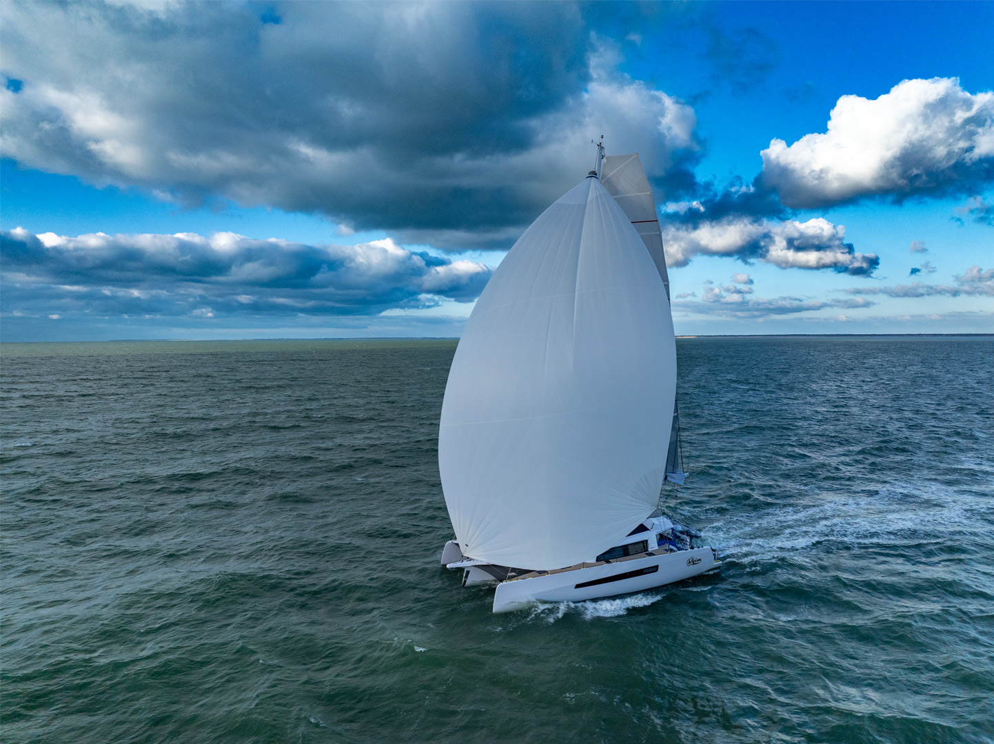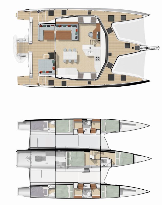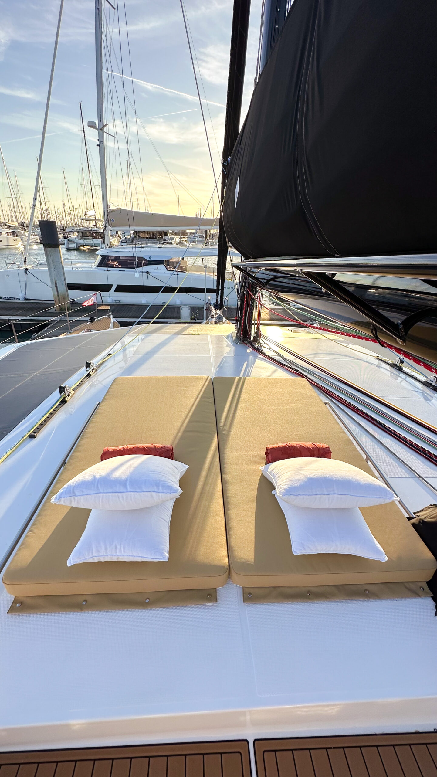 The living space on one level is highly ergonomic and entirely open plan, offering exceptional luminosity. The kitchen and the chart table face forwards. The panoramic view from this huge saloon is breathtaking. Both elegant and simple, the decoration lends the NEEL 52 a look of timeless distinction and gives the ample living space a calming atmosphere.
